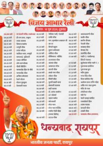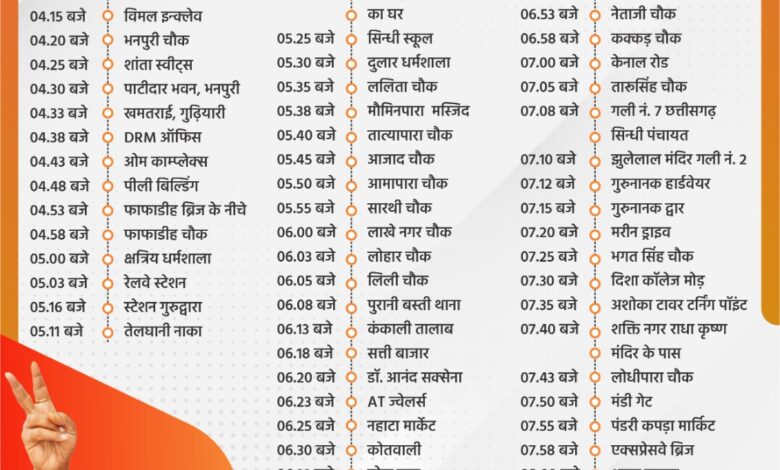 उनकी यह रैली मां बंजारी मंदिर रावाभाटा बिरगांव से संध्या 4:00 बजे प्रारंभ होगी। पश्चात 04.05 बजे डी-एम टावर, उरकुरा,04.10 बजे व्यास तालाब, 04.15 बजे विमल इन्क्लेव, 04.20 बजे भनपुरी चौक, 04.25 बजे शांता स्वीट्स, 04.30 बजे पाटीदार भवन, भनपुरी, 04.33 बजे खमतराई, गुढ़ियारी, 04.38 बजे DRM ऑफिस, 04.43 बजे ओम काम्प्लेक्स, 04.48 बजे पीली बिल्डिंग, 04.53 बजे फाफाडीह ब्रिज के नीचे, 04.58 बजे फाफाडीह चौक, 05.00 बजे क्षत्रिय धर्मशाला, 05.03 बजे रेलवे स्टेशन, 05.16 बजे स्टेशन गुरुद्वारा, 05.11 बजे तेलघानी नाका, 05.14 बजे नेमीचंद गली, गंजमंडी, 05.17 बजे राठौर चौक, 05.20 बजे मान. बृजमोहन अग्रवाल जी का घर, 05.25 बजे सिन्धी स्कूल,05.30 बजे दुलार धर्मशाला, 05.35 बजे ललिता चौक, 05.38 बजे मौमिनपारा मस्जिद, 05.40 बजे तातयापारा चौक, 05.45 बजे आजाद चौक, 05.50 बजे आमापारा चौक, 05.55 बजे सारथी चौक, 06.00 बजे लाखे नगर चौक, 06.03 बजे लोहार चौक, 06.05 बजे लिली चौक, 06.08 बजे पुरानी बस्ती थाना, 06.13 बजे कंकाली तालाब, 06.18 बजे सत्ती बाजार, 06.20 बजे डॉ. आनंद सक्सेना, 06.23 बजे AT ज्वेलर्स, 06.25 बजे नहाटा मार्केट, 06.30 बजे कोतवाली, 06.33 बजे छोटा पारा, 06.35 बजे छोटा पारा मस्जिद, 06.38 बजे राजीव गांधी चौक (फायर ब्रिगेड), 06.40 बजे OCM चौक, 06.43 बजे आकाशवाणी चौक, 06.48 बजे कबीर चौक, 06.50 बजे सागौन बँगला, 06.53 बजे नेताजी चौक, 06.58 बजे कक्कड़ चौक, 07.00 बजे केनाल रोड, 07.05 बजे तारुसिंह चौक, 07.08 बजे गली नं. 7 छत्तीसगढ़ सिन्धी पंचायत, 07.10 बजे झुलेलाल मंदिर गली नं. 2, 07.12 बजे गुरुनानक हार्डवेयर, 07.15 बजे गुरुनानक द्वार, 07.20 बजे मरीन ड्राइव, 07.25 बजे भगत सिंह चौक, 07.30 बजे दिशा कॉलेज मोड़, 07.35 बजे अशोका टावर टर्निंग पॉइंट, 07.40 बजे शक्ति नगर राधा कृष्ण, 07.43 बजे मंदिर के पास लोधीपारा चौक, 07.50 बजे मंडी गेट, 07.55 बजे पंडरी कपड़ा मार्किट, 07.58 बजे एक्सप्रेसवे ब्रिज, 08.00 बजे श्याम प्लाजा, 08.05 बजे कचहरी चौक, 08.10 बजे शास्त्री चौक, 08.15 बजे जयस्तंभ चौक पर रैली का समापन होगा।